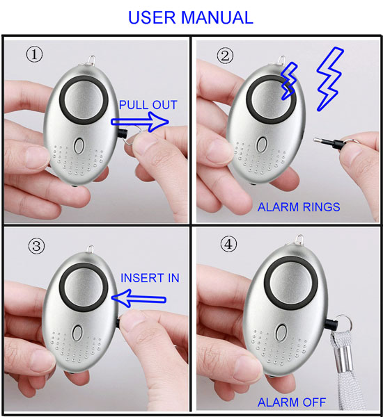- Pull the pin out to activate the alarm and insert it back to stop it.The sounds could last 50 minutes continuous piercing alarm